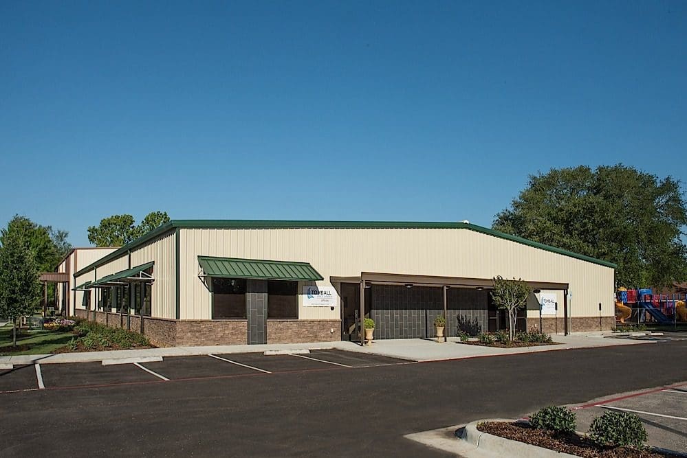 The Tomball Bible Church new Multipurpose Building is a pre-engineered metal building with a stone and pre-finished metal wall panel exterior and a standing seam roof. This 15,480 square-foot facility includes a pre-school, nursey, and a youth worship area.