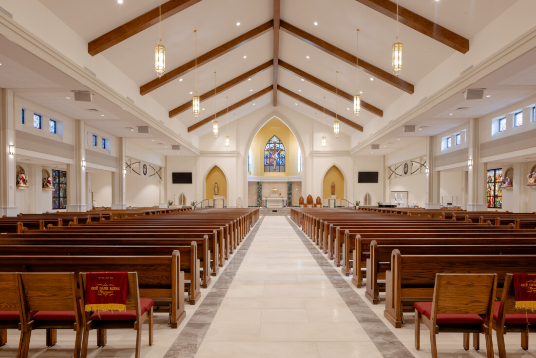 This project included removing and replacing the existing Sanctuary of the Vietnamese Martyrs Catholic Church, originally constructed in 1992. The new facility almost doubles the seating capacity and better accommodates the growing Vietnamese/American congregation at the parish. The façade is highly ornamented in recognition of the Church’s Vietnamese heritage, and the high-end interior finishes include marble flooring and wood trim throughout. Historic stained-glass windows and liturgical furnishings from the Archdiocese’s original Co-Cathedral were relocated and installed in the Sanctuary.