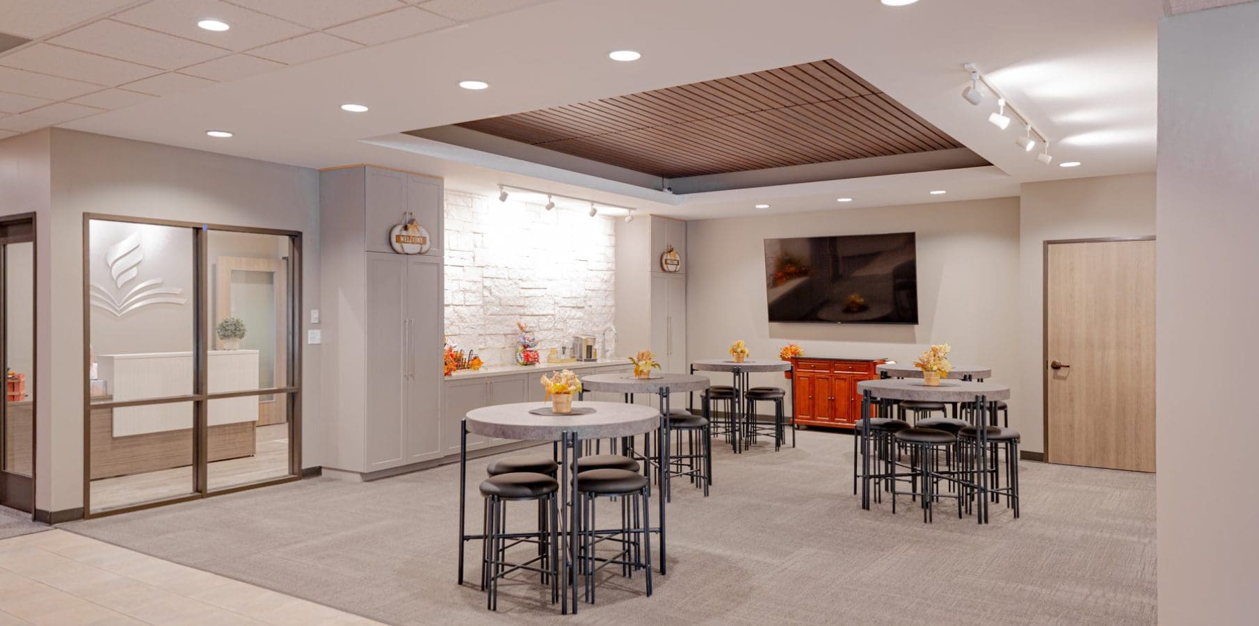 The LivingWord Lutheran Church upgrades and renovations project consists of two phases. The first phase of renovations consisted of relocating the reception area to the main entry and adding a coffee bar/ welcome center. Additional work included upgraded restrooms, a new check-in counter for the nursery, and upgrades to the pastoral suite/ conference areas. Phase two will consist of upgrades to the worship center to address some acoustical issues as well as modernize the feel of the space.