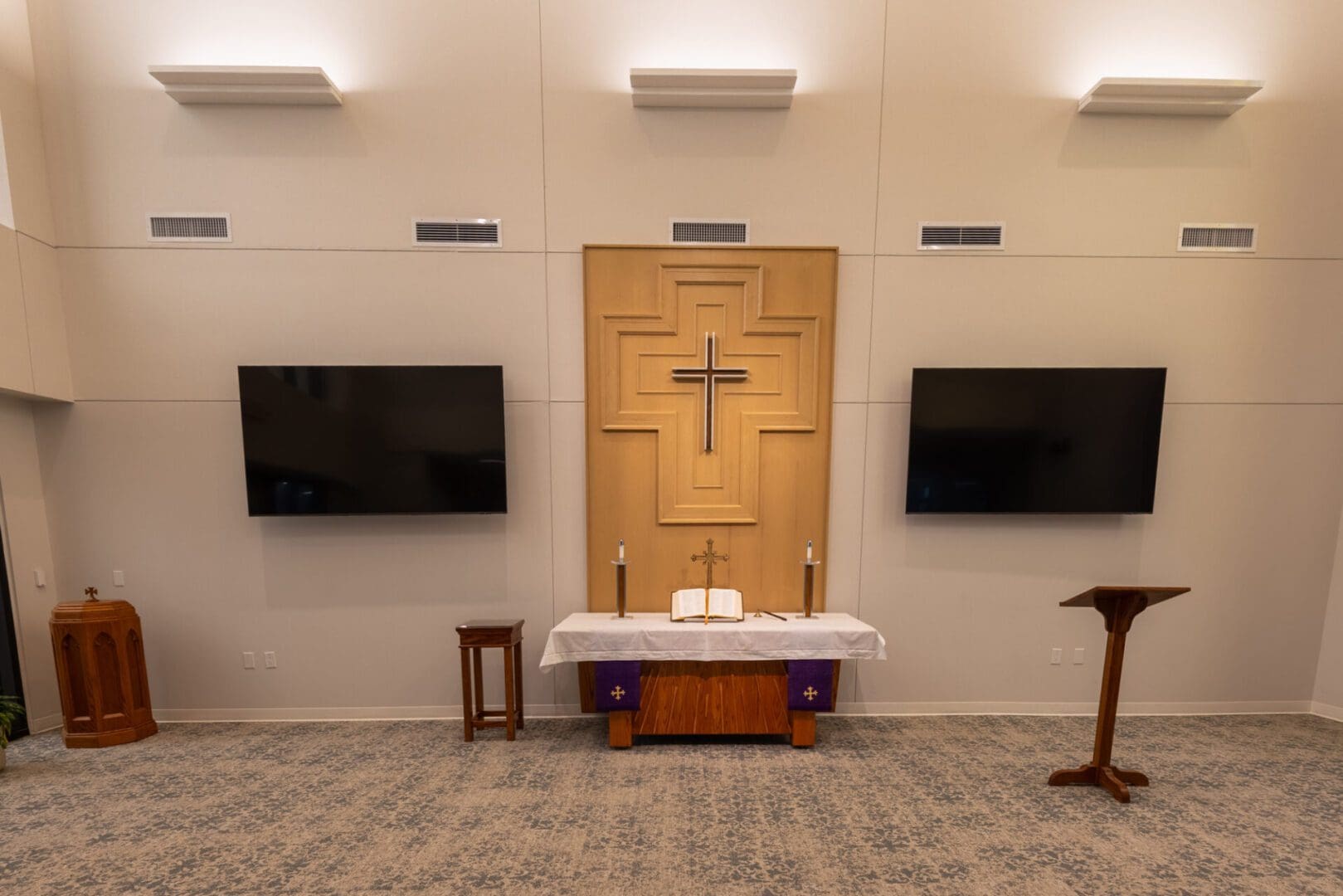 The new Texas District Mission Support Center is located in north Round Rock. The 15,000 square foot single-story structure is clad in Texas Limestone and plaster, with a standing seam metal roof and corresponding over-window canopies. The building houses three major departments within the Texas District of The Lutheran Church, and also includes a Chapel and two Large Meeting Rooms. The prominent feature of the building is a large stained glass window depicting “Christ – the Light of the World” as designed by I H S Studios of Fredericksburg.